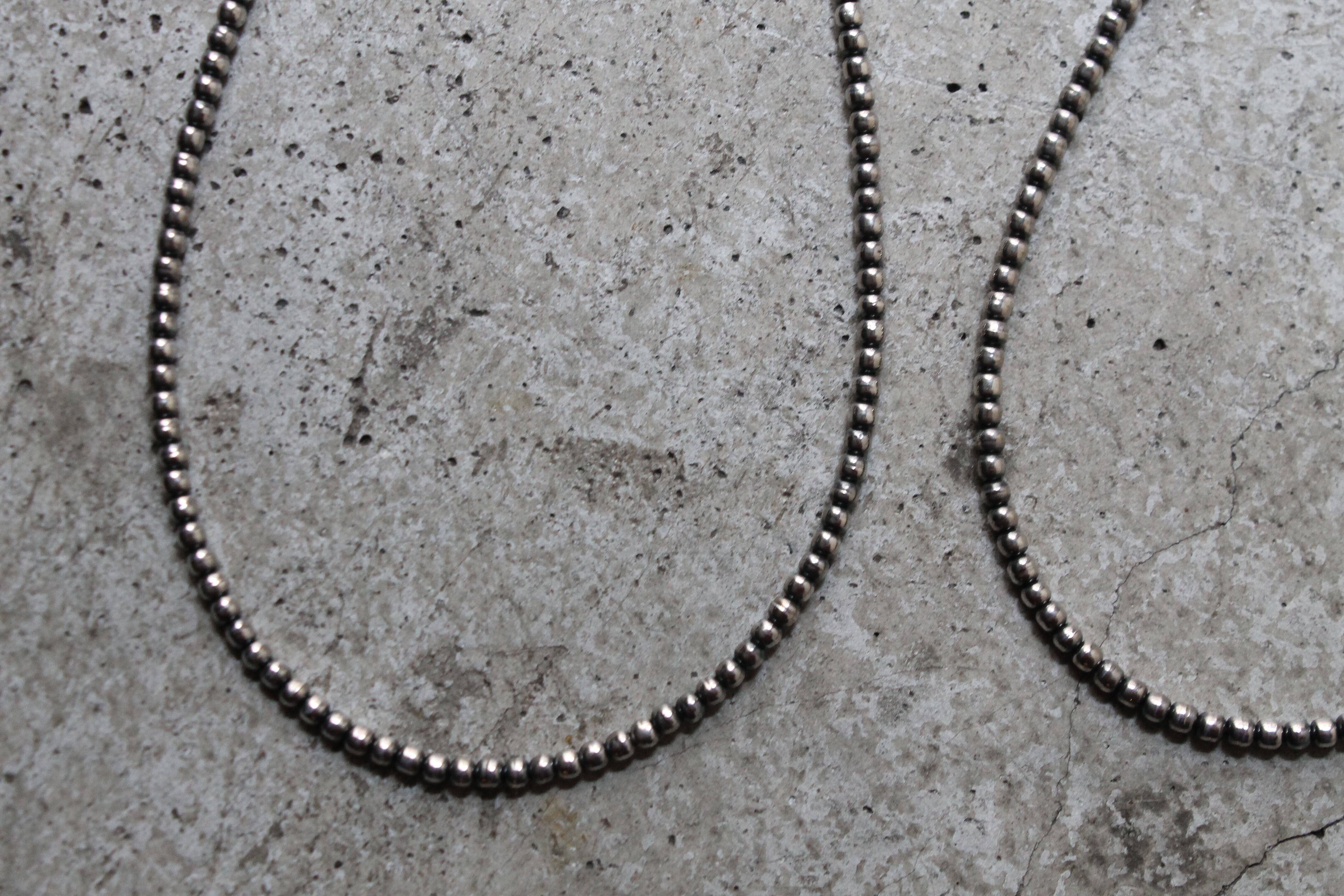 ナバホパールと呼ばれる美しいスタイルのジュエリーは、ナバホの銀細 工職人によって伝統的に作られたスターリングシルバービーズです。 ナバホ族が暮らすHOGANという住居の形状からHOGAN BEADSとも呼ばれ ています。 ナバホ族は、ニューメキシコ、アリゾナ、ユタにまたがる最大のネイ ティブアメリカンの部族です。 1500年代以前にさかのぼり、ナバホ族は、木、石、動物の骨や歯、貝殻 など、利用可能な天然素材からビーズを作成していました。 時が経つにつれて、銀や銅などの新しい素材がヨーロッパ人によって導 入され、ナバホのアーティストはこれらの素材を作品に取り入れ始めま した。 ナバホ 族は一般的にビーズを使用して物語を語り、世代から世代へと受け継い でいます。