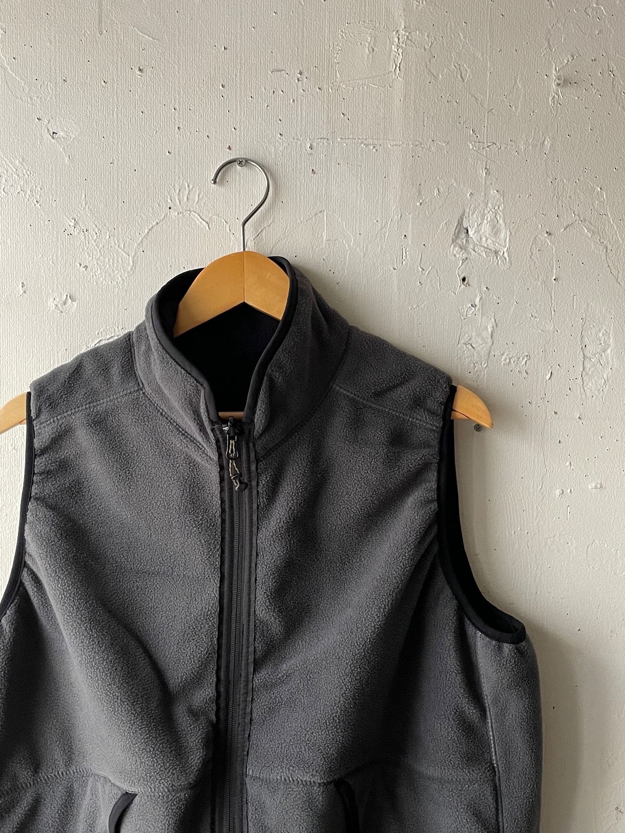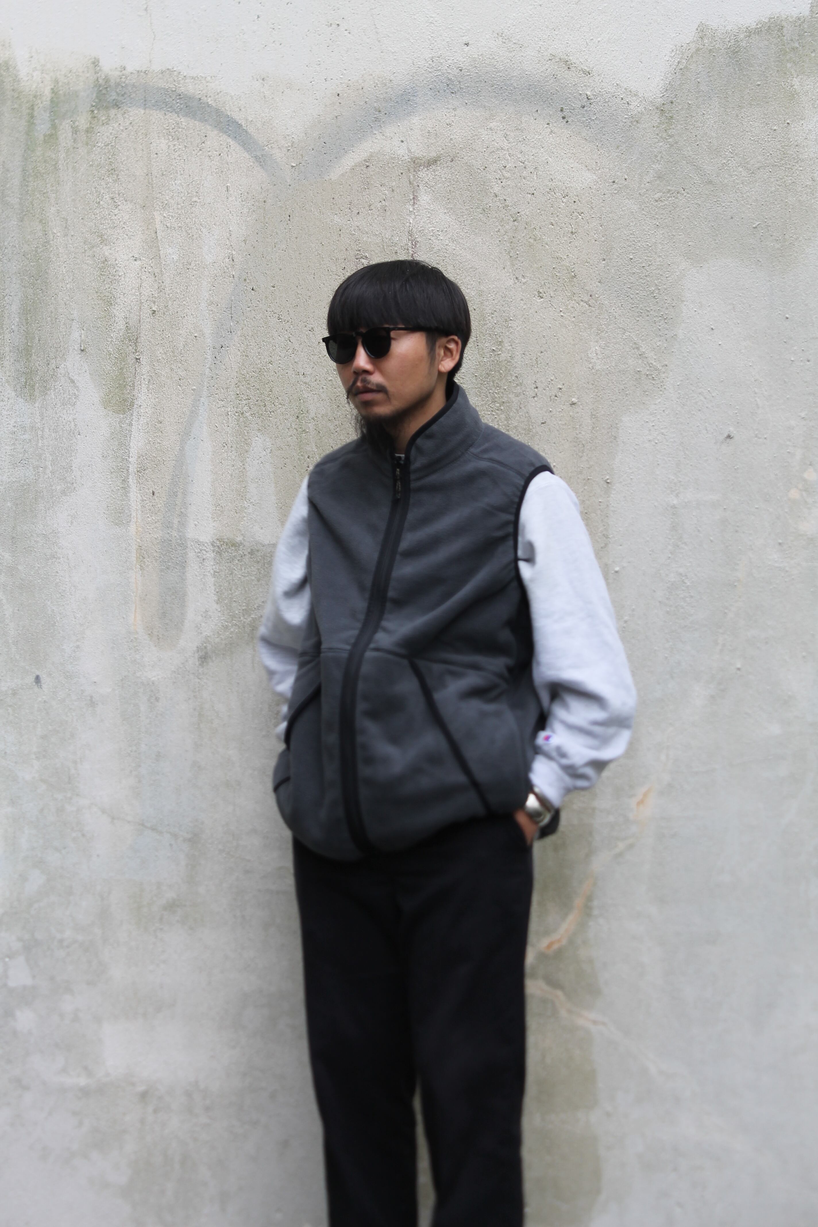90年代のベストから着想を得た一着。身幅のあるベストはアームホールや裾を身体に 吸い付くように設定し、クラシカルな雰囲気に。両面にポケットを付け、フリース面とナイロン面のリバーシブル仕様にした 一着は機能的でその日の気分で着まわして頂けます。ハ90年代のアウトドアを彷彿とさせるようなナイロン、フリース面の 色使いが魅力的。22FWシーズンは撥水性をそのままにアウトドアブランドではお馴染みの60/40(ロクヨン)クロスの 様な生地の織りを表現。