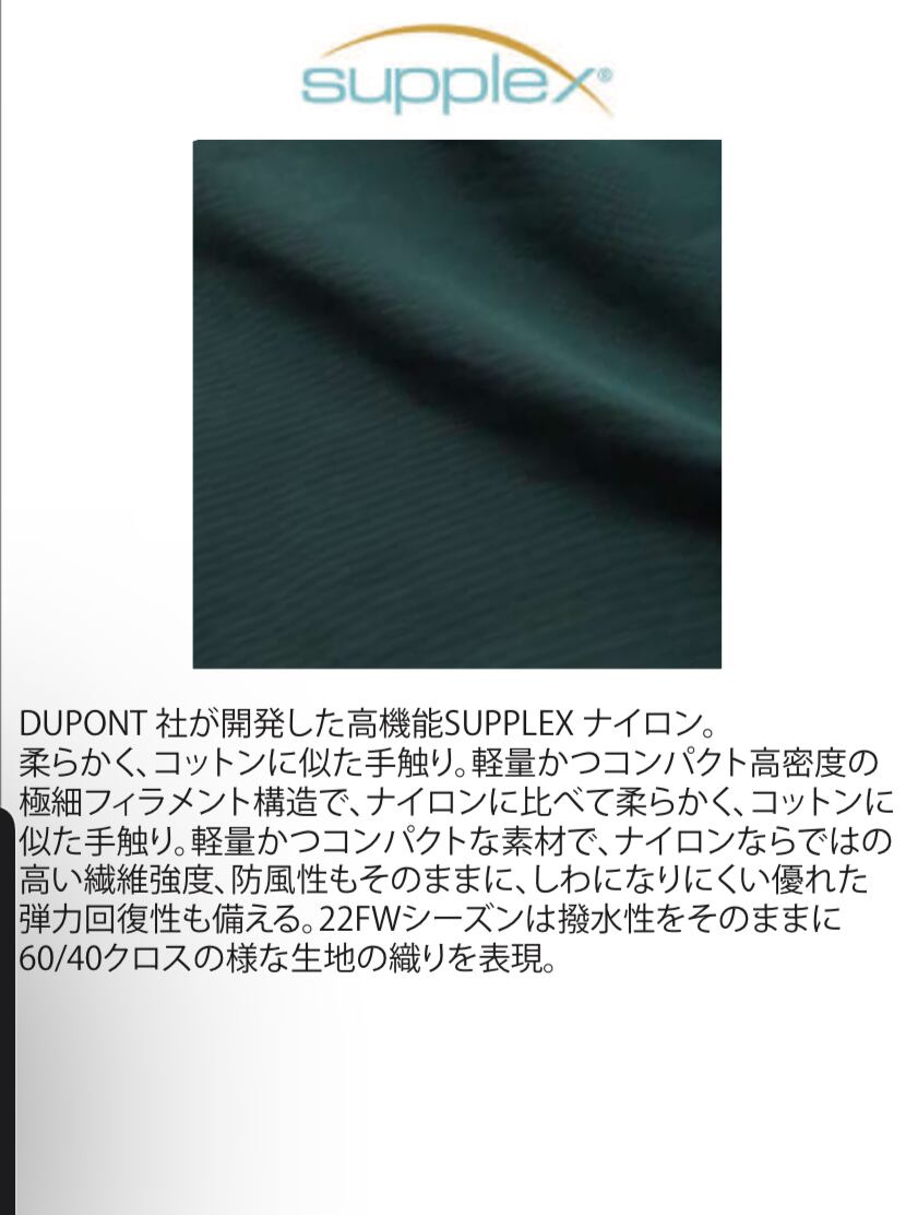 DUPONT 社が開発した高機能SUPPLEX ナイロン。 柔らかく、コットンに似た手触り。軽量かつコンパクト高密度の 極細フィラメント構造で、ナイロンに比べて柔らかく、コットンに 似た手触り。軽量かつコンパクトな素材で、ナイロンならではの 高い繊維強度、防風性もそのままに、しわになりにくい優れた 弾力回復性も備える。22FWシーズンは撥水性をそのままに 60/40クロスの様な生地の織りを表現。