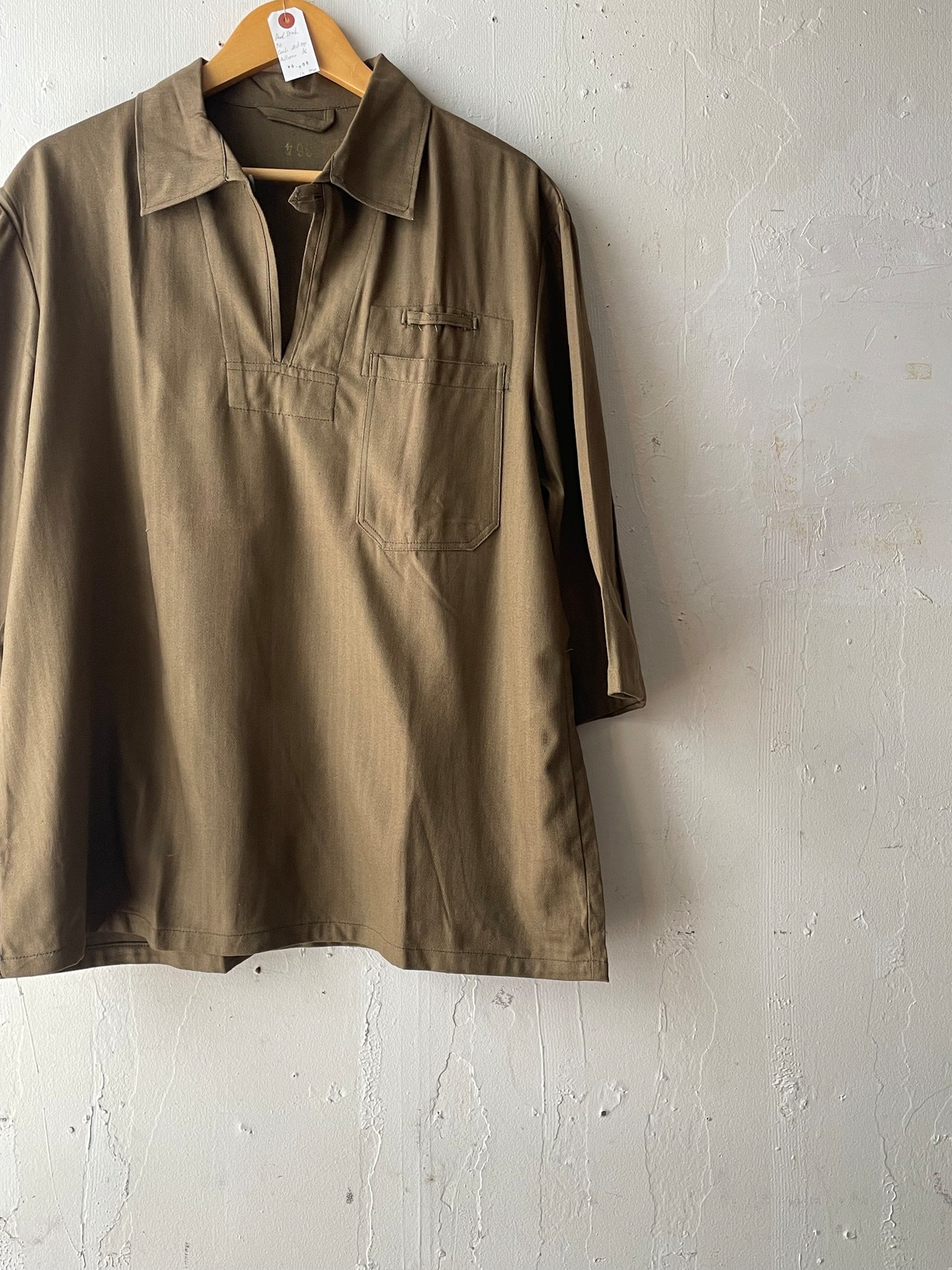 風合いの良いコットンヘリンボーンが使用された70's-80'sチェコ軍のプルオーバーワークシャツです。ループ留めのボタンが内側に隠れた珍しい作りで、胸の開きがざっくりとしていてリラックスした着用感です。渋めのブラウンカラーも着こなしに良い雰囲気を持たせてくれるのではないでしょうか。